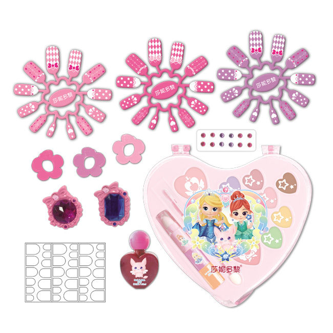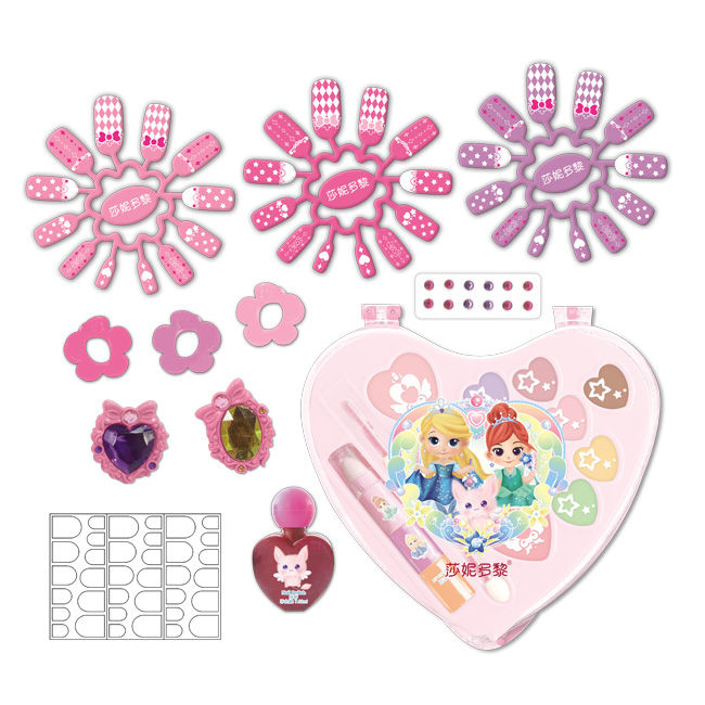 8色眼影膏,3色腮红膏,3只唇膏,2只唇彩,1只指彩,1片宝石贴纸,3只小发夹,3只指甲圈,3片双面贴纸
