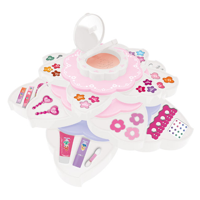 产品: 9色眼影膏,9色唇彩,6色腮红膏,1色粉饼,5色唇膏,1只指彩,1只啫喱,3只小发夹,1只分指器,1片宝石贴纸,5支化妆刷,1只粉扑,1对耳环,1只指甲锉,1只指甲圈,1片双面贴纸