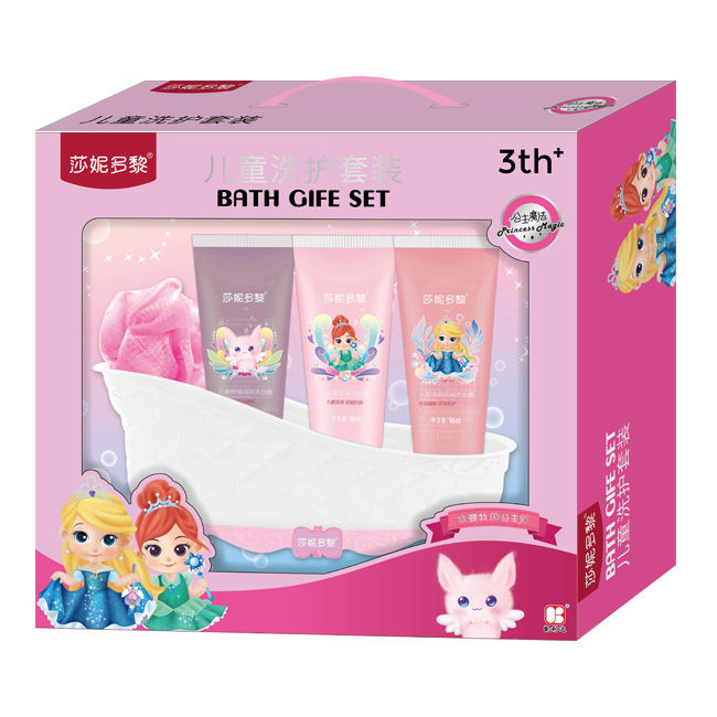 1瓶96ML 沐浴露,1瓶96ML 洗发露,1瓶96ML润肤乳,1只沐浴球,1只小浴盆