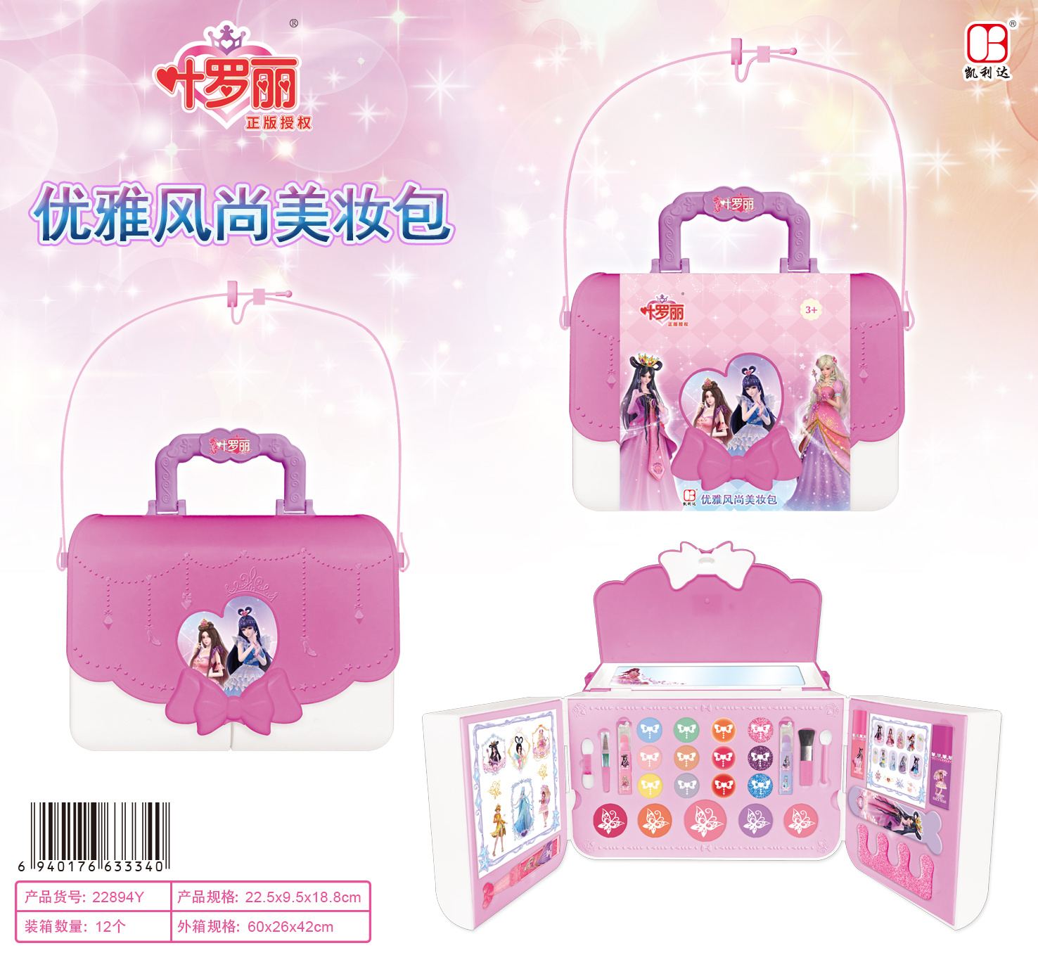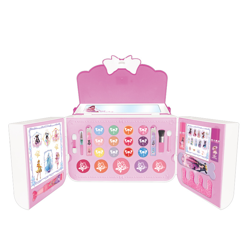 产品: 6色眼影膏,5色腮红膏,4色唇膏,3色闪粉唇彩,3色唇彩,2色水性指甲油,1色闪粉,1张纹身指甲贴纸,1个分指器,1个指甲锉,1张指甲贴纸,4条化妆刷