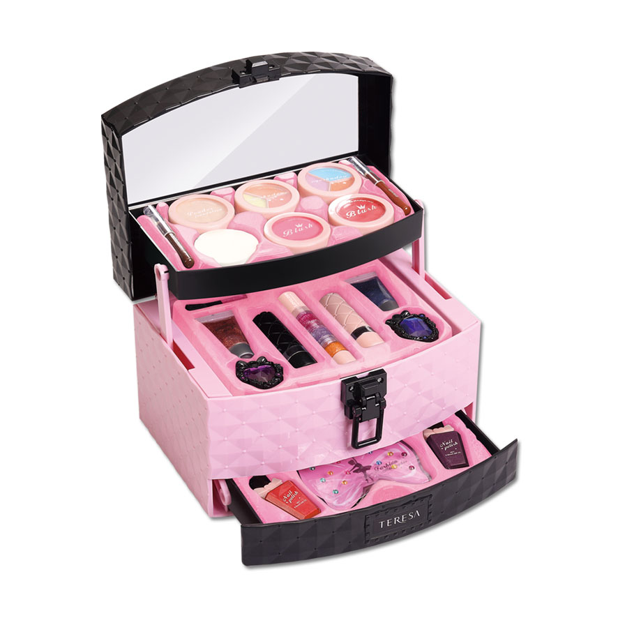 1只粉饼,2只眼影,2只腮红,2只眉笔,1只粉扑,2只啫喱,2只唇膏,2只唇彩戒指,3节唇彩,3支化妆刷,2只指甲油,1片钻石小卡